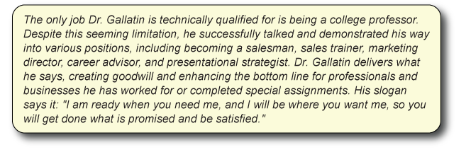 Dr. Gallatin was a presentational trainer and salesperson for a career services firm in Manhattan, assisting mid-and high-level executives seeking new positions and career advice. He also ran a resume service on Madison Avenue for the largest resume service in the United States and was director of Grand Street Settlements Job Cooperative.